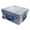 PelicanColorCase apresenta novo Silver 1610 com alças e travas azuis. Rodas robustas de poliuretano com rolamentos de aço inoxidável. À prova d’água, à prova de esmagamento e à prova de poeira. Válvula de equalização de pressão automática – equilibra a pressão interior, mantém a água fora. Travas de lançamento duplo fáceis de abrir. Dobre as alças. O-ring seal. Núcleo de célula aberta com design de parede sólida – peso leve e forte. Alça de extensão retrátil. Hardware de aço inoxidável e protetores de cadeado